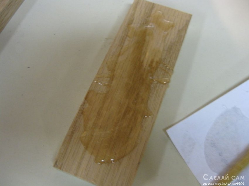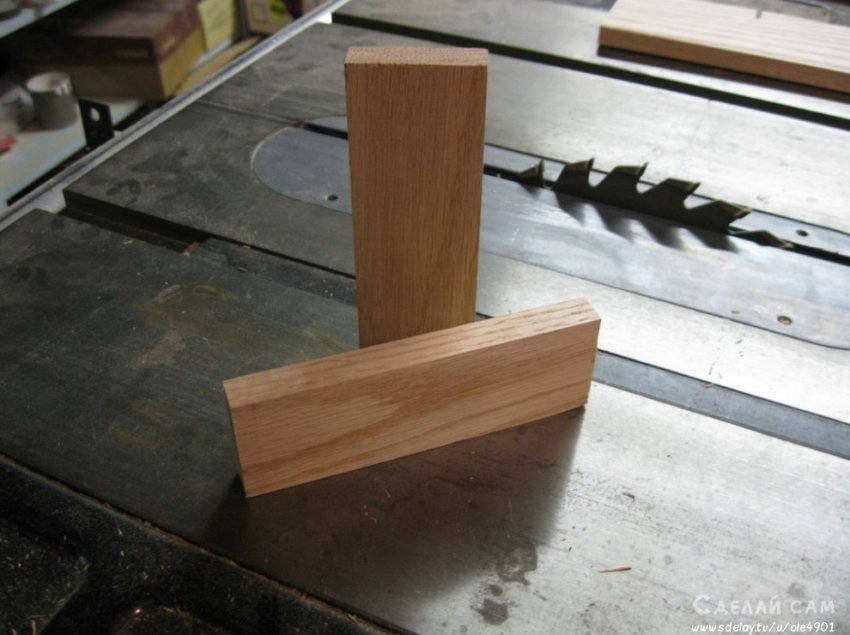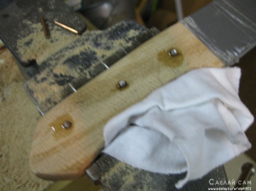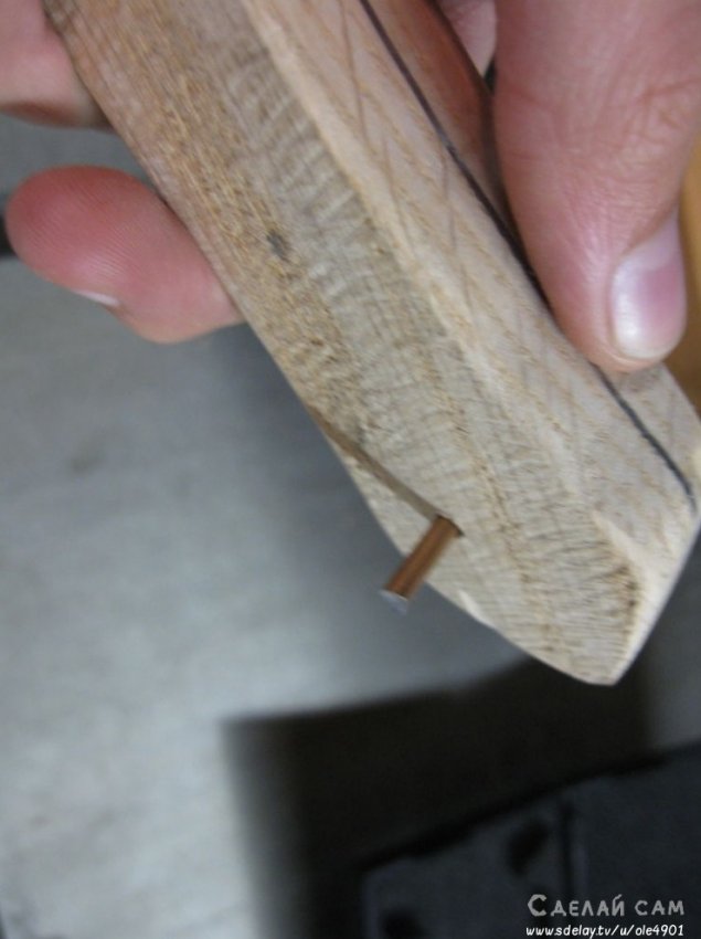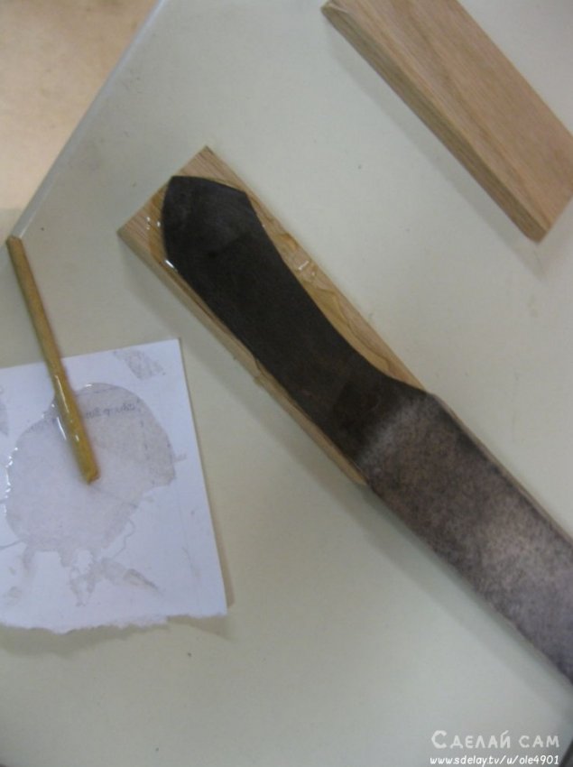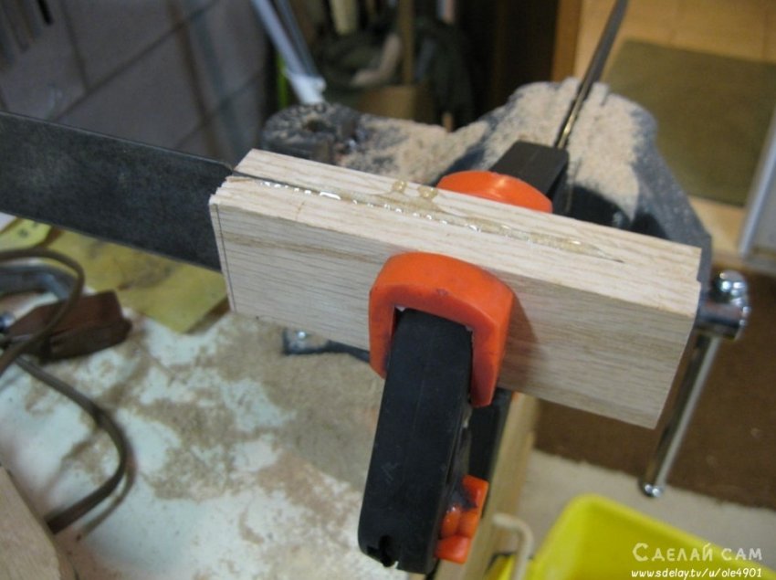С ручкой все просто. Берем два небольших брусочка, в нашем случае - дуб. Важно, что бы на брусках не было никаких признаков вредителей, черешков и т.д. Это очень важно! С помощью деревянного клея, промазываем соединение. Крепим на зижимки. Даем возможность застыть.
