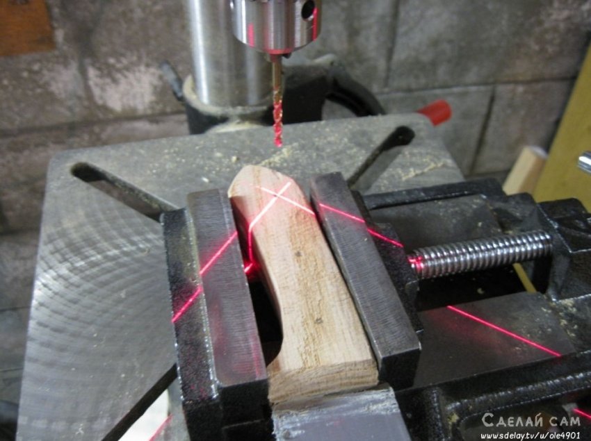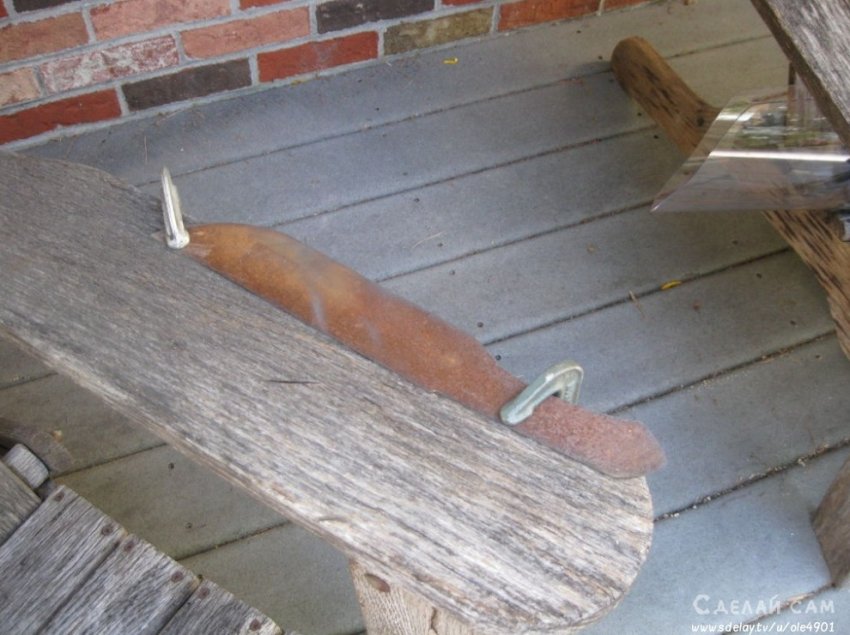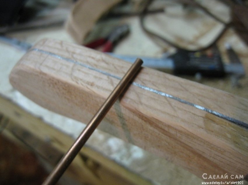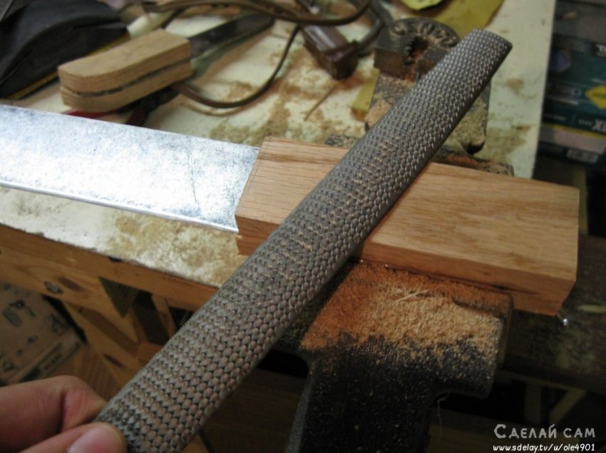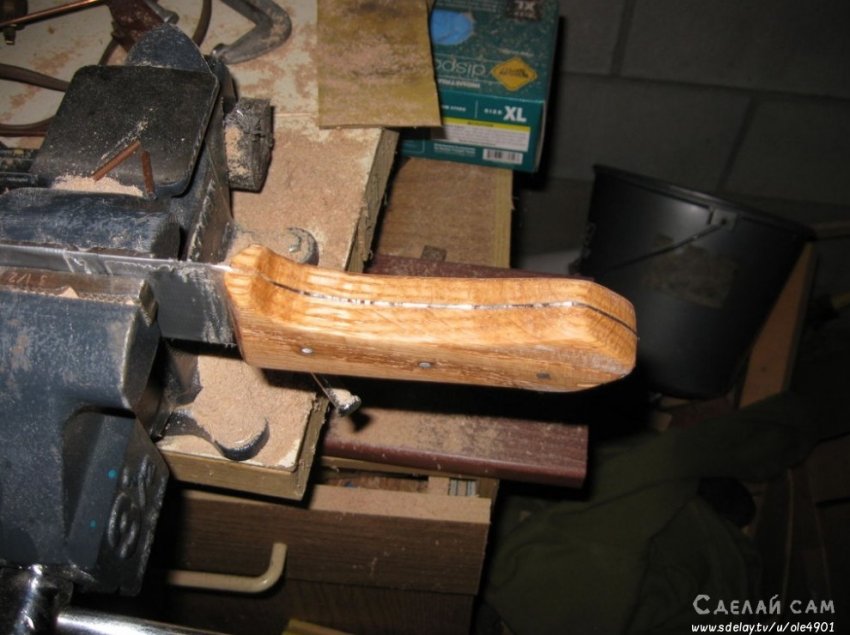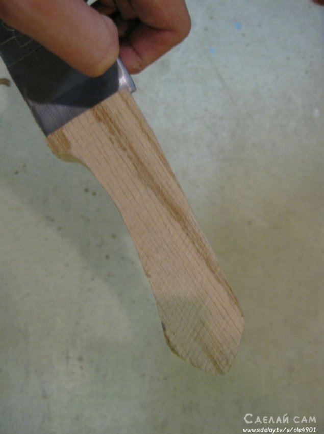 Стачиваем все лишние части дерева, формируя удобную ручку, под размер клинка.