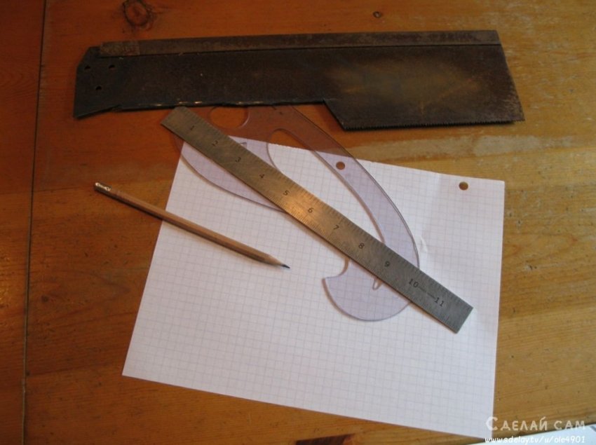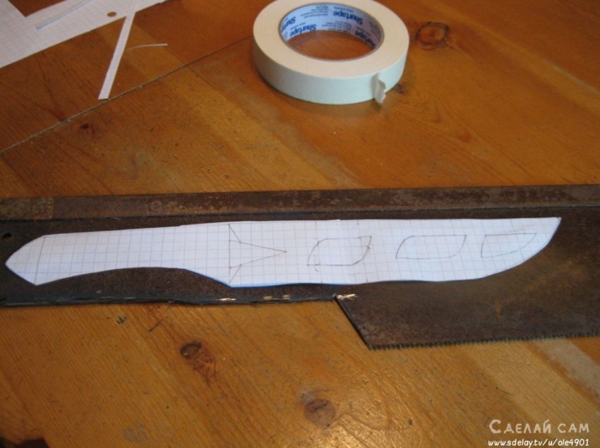 После проектировки, вырезаем на небольшой прототип из бумаги. Прикладываем к металлу, обводим его. За основу берем обрезок старой, толстой ножовки по металлу (достаточно прочной).