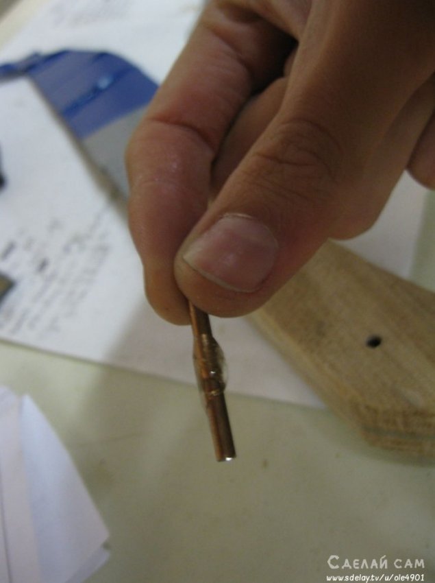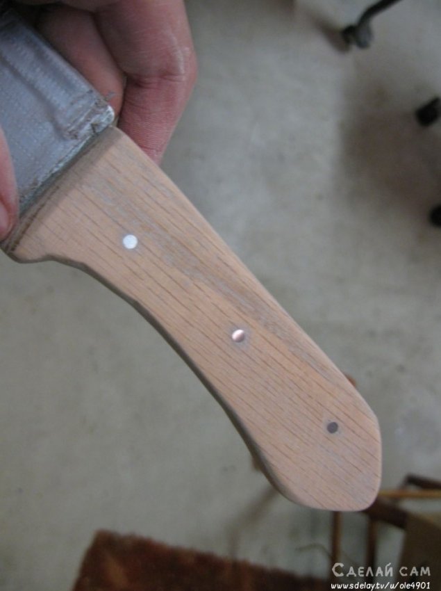В ручке высверливаем с помощью очень прочного сверла, с алмазным напылением, несколько отверстий. С помощью медных заклепок крепим всю конструкцию. Вместе с заклепкой, в отверстие добавляем немного клея, для прочности.