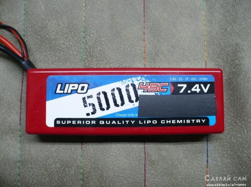 Теперь самое интересное-питание всего этого агрегата.В моем вариате это аккумулятор от радиоуправляемого моделизма 7.4вольт-5А LIPO(2500-3500руб-средне-хорошего качества)При желании можно найти и за 1000-1500рублей-но при тех же параметрах он будет работать в 2-3 раза меньше и через годик активной работы(50-100 циклов заряд-разряд)-дружно,всей семьей провожаем его в утиль-естественно за противопожарный корпус вообще молчу.Увлекательные видео -КАК ГОРЯТ липо аккумы от моделизма и не только-можно глянуть на ютубе.