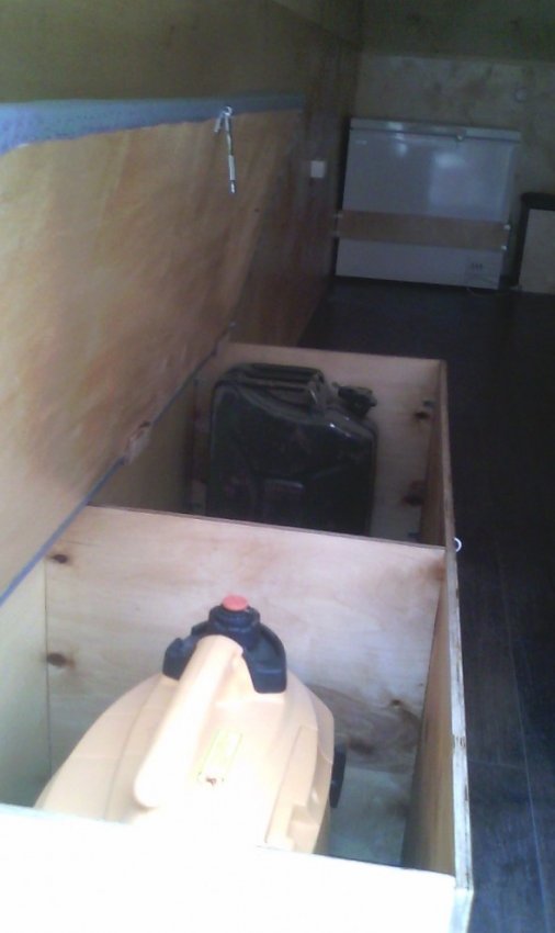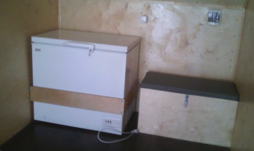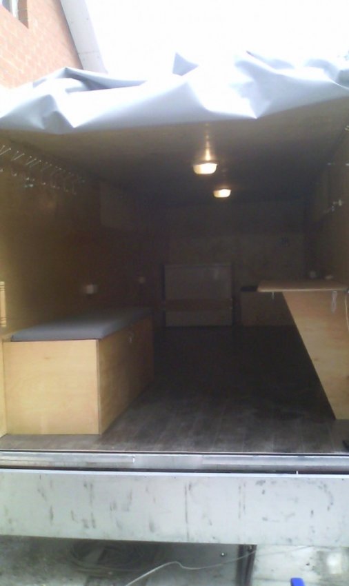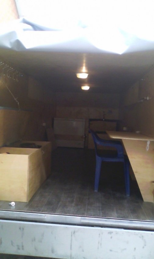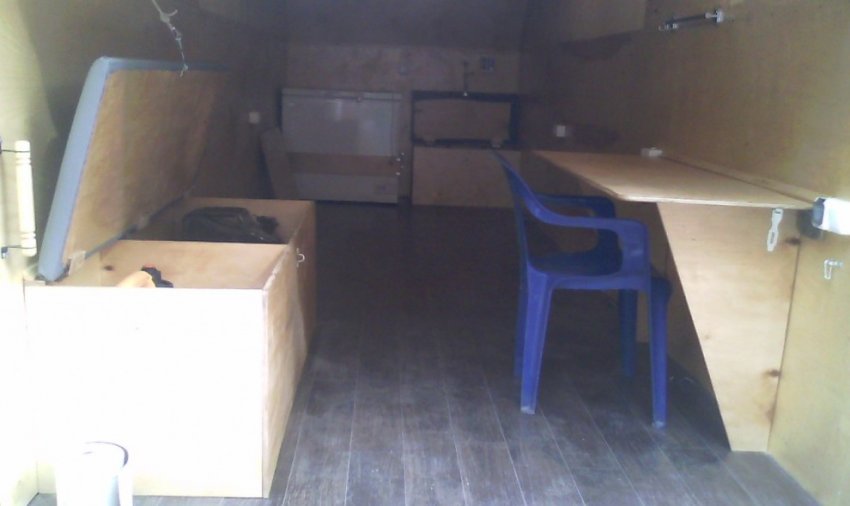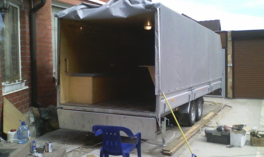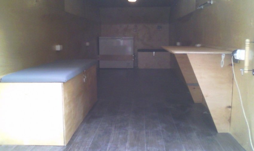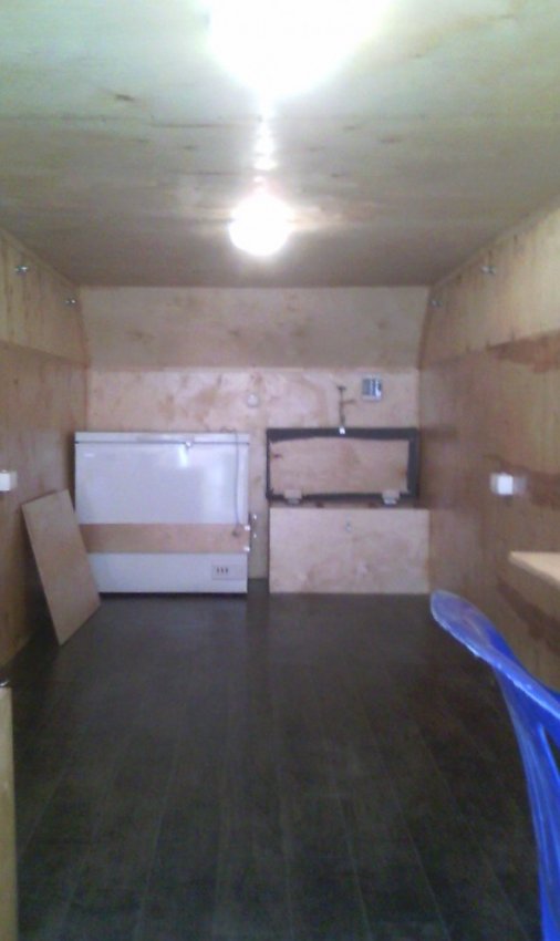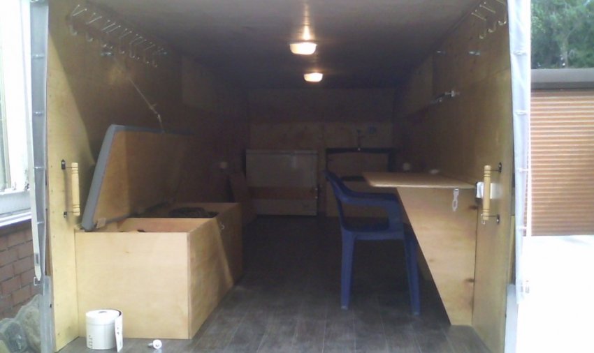 обшили каркас прицепа доской (предали жесткость),затем зафанировали,покрыли яхтным лаком всё снутри и снаружи на 2 раза, сделали мебель. по стенам и полу в шахматном порядке усилинные кольца для крепления груза (предполагалась большая мотор.лодка, раскладушки ну т.д. и т.п.) мебель тоже вся фиксируется.генератор,топливо,плитка. на крышу(на скошенную часть) предполагался 200 литровый бак для воды и душ.