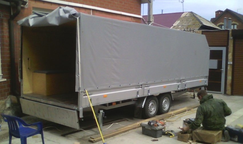 Прошлым летом делал один необычный заказ. у заказчика был 6ти метровый тентованный прицеп. он хотел рыбацкий походный трейлер. Представляю вашему вниманию что получилось.
