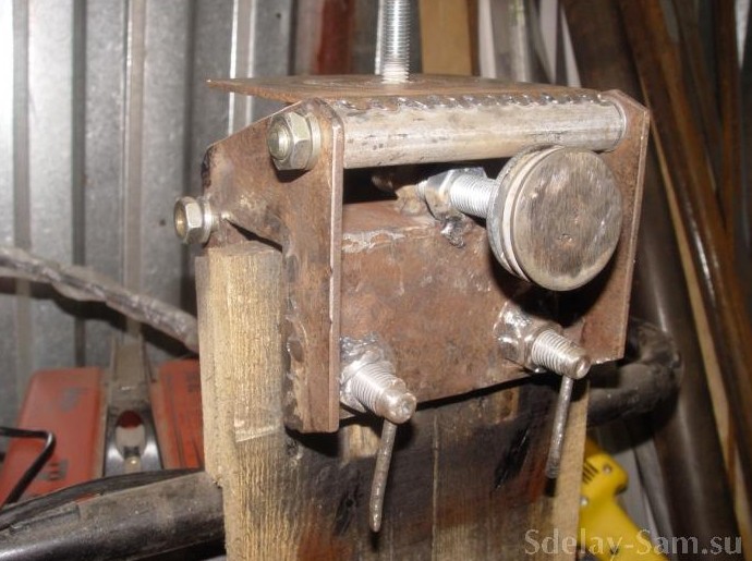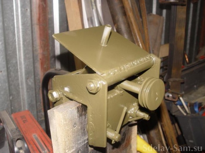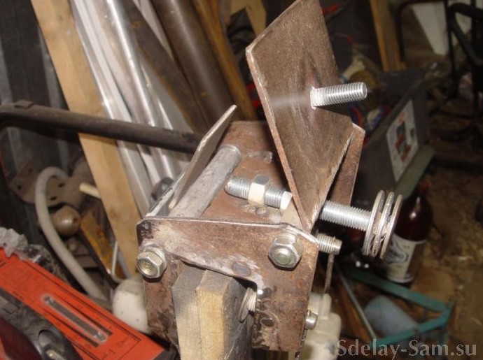 Конструкция понятна из фото. Верхний болт это ось на которую потом сажается мотор. А с боку болт, при перемещении которого, регулируется угол наклона верхней опорной пластины и всего двигателя вцелом.