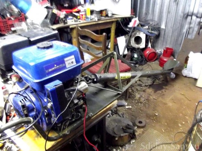 Стандартный китайский мотор от сельхозтехники установил на опорную платформу. Трубу с установленным в ней валом через карданную муфту монтируем на вал двигателя и только после этого отъюстировав ее по уровню и наклону привариваем к платформе и щеке мотора по месту.