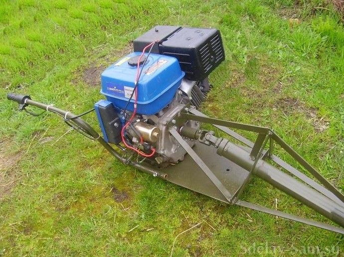 Здравствуйте дорогие самодельщики. Меня зовут Андрей, я из Москвы. Хочу поделиться с Вами своим последним изделием. Для начала немного лирики и истории. Идешь на рыбалку или охоту и думаешь хватит ли сил на обратную дорогу? Ведь сегодня решил и в затон сходить, поблеснить щукаря среди лопухов и на тяге вечерней у дальнего острова в тростнике постоять, а к нему только полчаса через заросшие протоки толкаться… Ведь, как известно, как раз на границе с густо заросшей водорослями части водоема и прячется вожделенная рыболовами добыча – щука. Да и колонии утки – самой динамичной, многочисленной и интересной дичи осенней охоты редко выбираются на открытую воду. При отсутствии собаки охотнику, порой, приходится, километры проталкивать лодку шестом через заросли камыша и тростника. Иногда плотность зарослей такова, что лодка продвигаясь по ним как будто лезет на берег. О применении подвесного лодочного мотора, охлаждаемого забортной водой тут не может быть и речи, а вот болезненные мозоли, стертые в кровь обеспечены. Вот и задумываешься о каком-нибудь средстве механизации, что бы добраться до нужного водного угодья. Тут и пригодился бы подвесной болотоход. В основном для охлаждения лодочных двигателе используется забортная вода. Проходимость таких судов в большой степени зависит от чистоты водоема. Любая водная растительность на нем становится определенной преградой движению. Мелководные и заболоченные водоемы становятся вообще не проходимыми. И вот в 40-х годах приходит идея использования движителя на разделе сред водяной и воздушной. Это мотор с полупогруженным пропеллером, который работает вблизи поверхности воды. Ярким примерами могут служить советский мотор-весло МВ-72 (с мотором мотоцикла М-72), мотор-весло MB-180 с использованием двигателя от бензопилы воздушного охлаждения и германский мотор-весло водяного охлаждения Maybach S5. Водяное охлаждение Maybach сводило на нет возможность его применения для движения судна по мелководью и водной растительности. А колоссальный вес не позволял оперативно перемещать его с судна на судно. Иначе к решению проблемы подошли водномоторники государств Юго-Восточной Азии. Здесь около 50 лет назад стали использовать для таких водоемов мотор-весло с двигателями воздушного охлаждения разных мощностей вплоть до автомобильных. Обуславливалось это, скорее всего, непомерной бедностью стран и недоступностью по цене для их населений более дорогих классических водных моторов. Однажды побывав во Вьетнаме и развивая не новую идею движителя воздушного охлаждения с полупогруженным винтом, которому не страшны мелководье, болота, грязь, заросли тростника и камыша, американец Уоррен Кок около 20 лет назад разработал первую опытную модель такого двигателя с укороченным валом. Дело в том, что очень длинные валы 3 метра и более, применяемые в Азии, обуславливаются не возможностью сильного наклона головки четырехтактного двигателя относительно горизонтального положения для погружения пропеллера в воду. Масло в картере двигателя стекает в сторону наклона и мотор, лишенный смазки перегревается. Поэтому Кок применил в конструкции карданный вал и задал при помощи него начальный угол наклона вала к воде. Наклон этот зависит от высоты борта лодки, на которую устанавливается мотор. Чем выше борт, тем в более нагруж