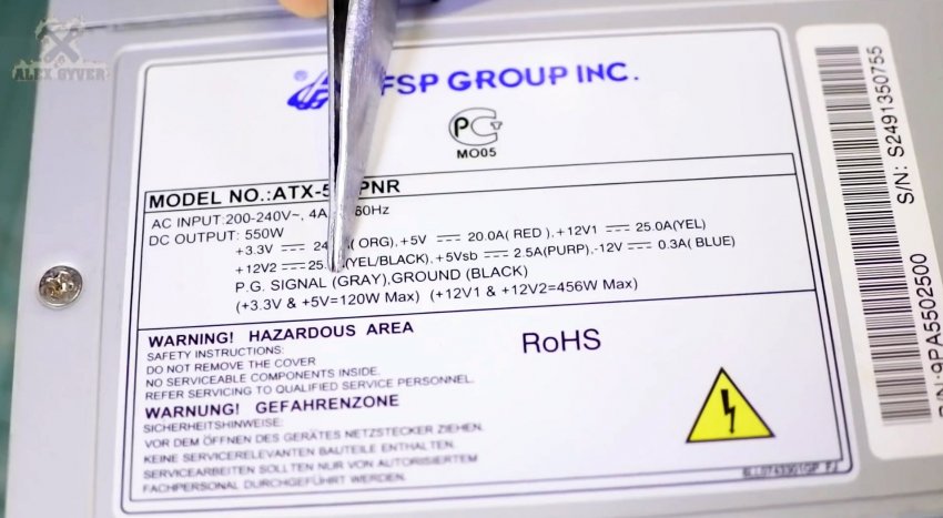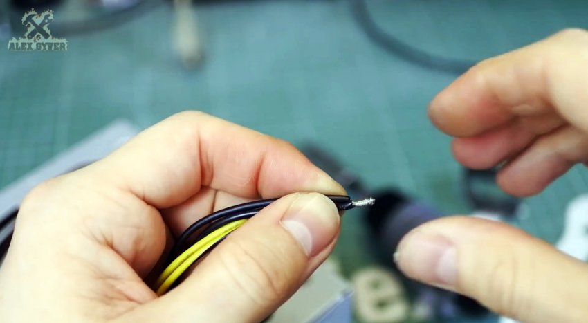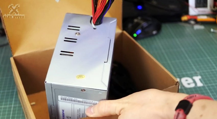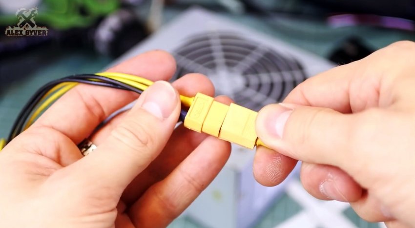 Перед установкой к клеммам припаивается конденсатор, чтобы блок питания от ПК не уходил в защиту от пусковых токов.