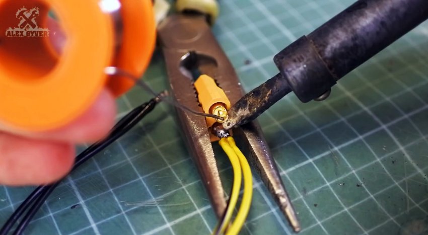Последние аккуратно отрываются от аккумуляторов, и к ним припаивается провод сечением 4 кв.мм. Затем клеммы вставляются в держатели.