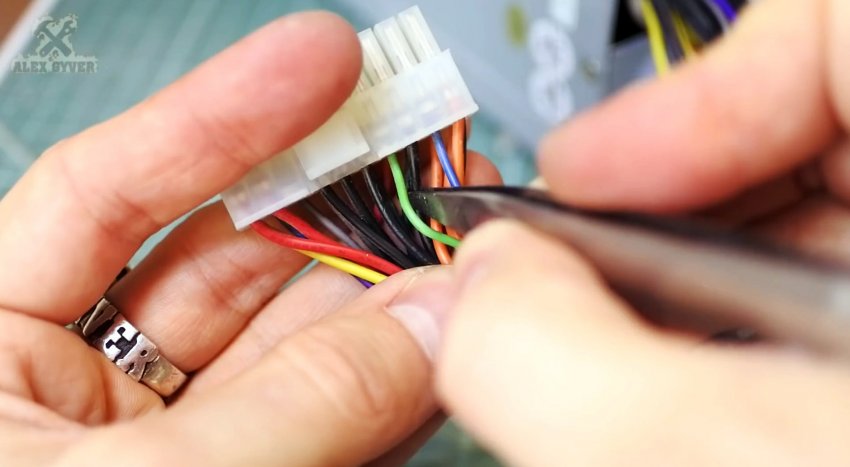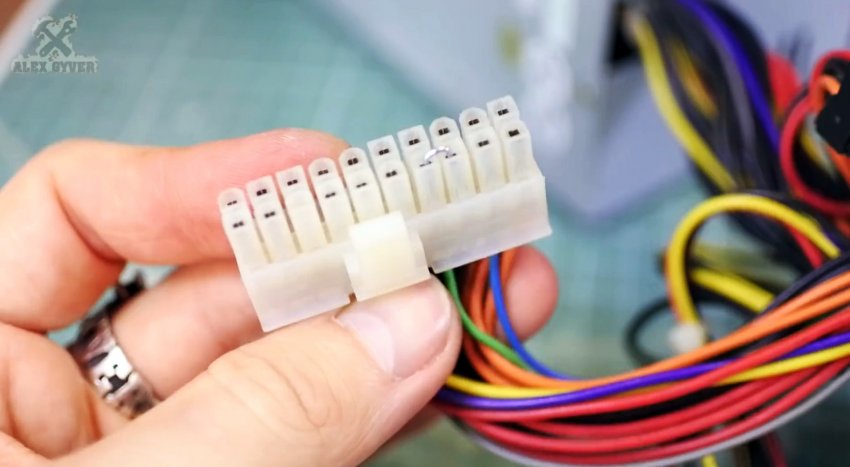 Чтобы блок питания включился без компьютера, нужно замкнуть любой черный провод на зеленый. Это можно сделать перемычкой из скрепки.