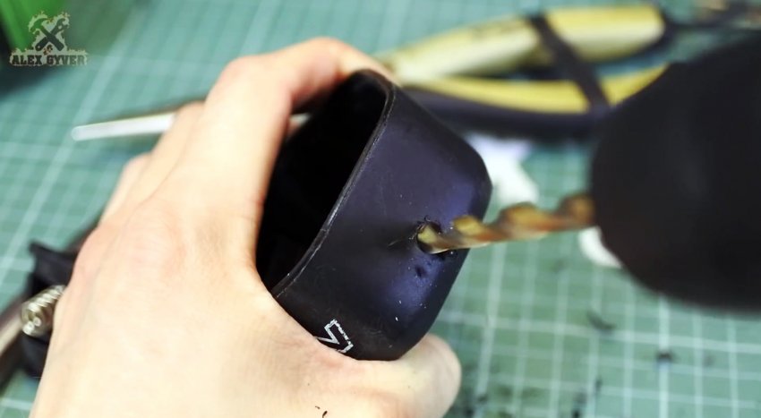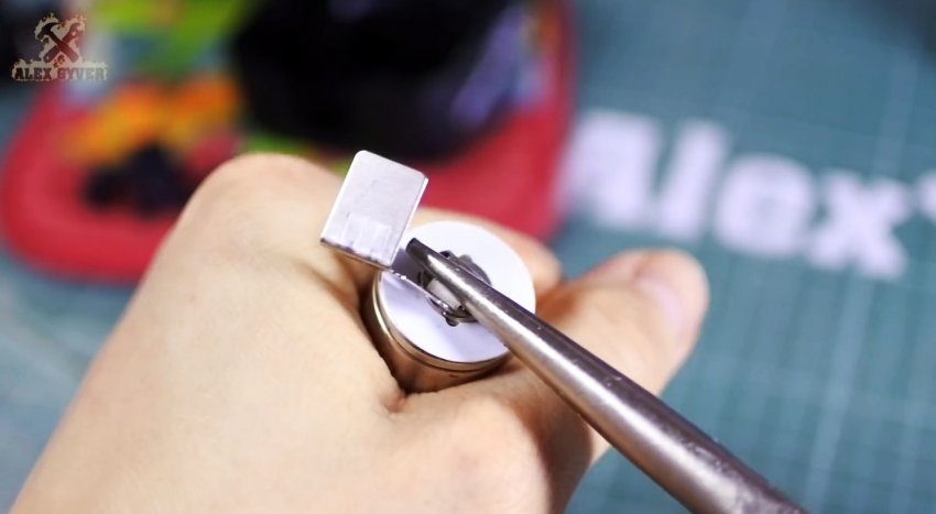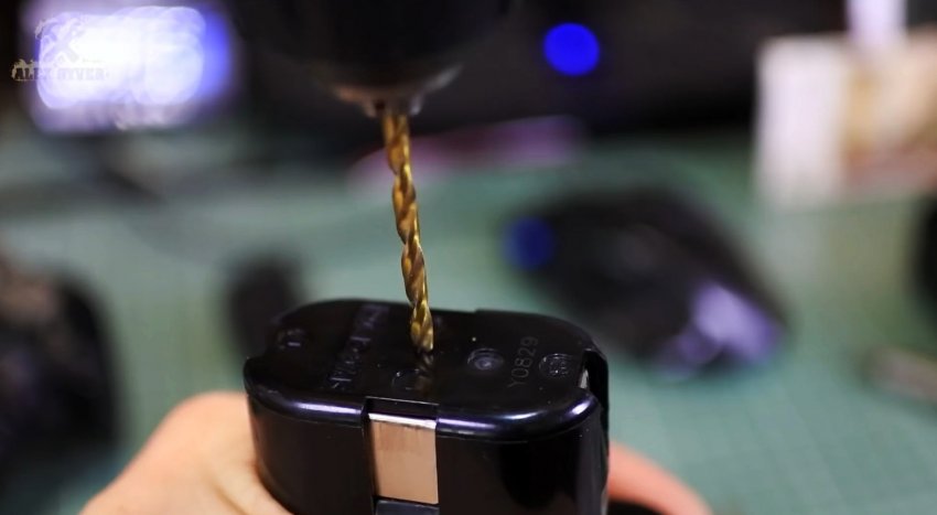 Далее нужно просверлить корпус аккумулятор, снять на отверстии фаску, чтобы через него прикрутить клеммодержатель винтиком М3, так как без элементов питания он держаться не будет.
