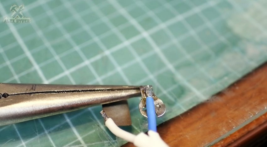 Так как конденсатор будет мешать придерживать гайку при закручивании винтика, то ее лучше приклеить к клеммодержателю. Сбоку корпуса аккумулятора просвечивается отверстие под провод.