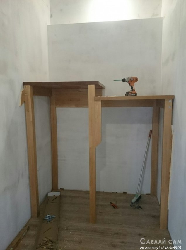 К стене также крепим одну сторону лестничной направляющей с прикрученной к ней в форме "пилы" доской. Левая направляющая крепится непосредственно к средней ноге, и к полу.