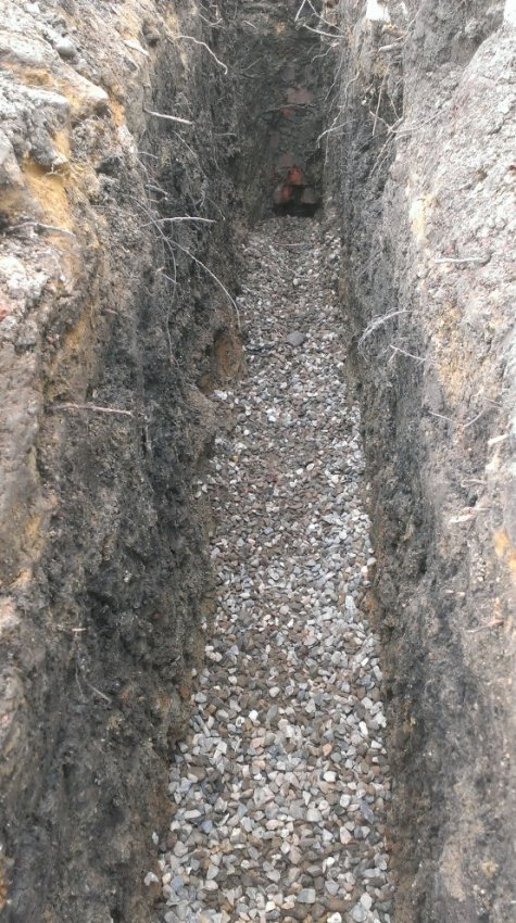 Дно траншеи засыпали щебнем по всей длине дренажа.