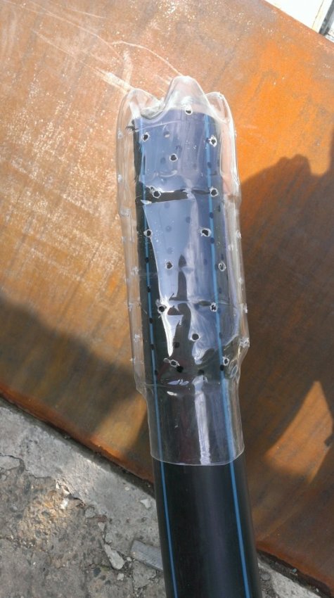 Трубу для дренажа брал черную полиэтиленовую (под воду). Трубу проложили на слой щебня. Конец трубы, что входит в колодец - сделали таким вот образом: насверлили дырок, взяли пластиковую бутылку и в ней тоже насверлили дырок. Получилось вот так