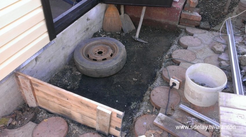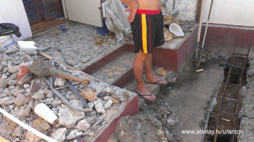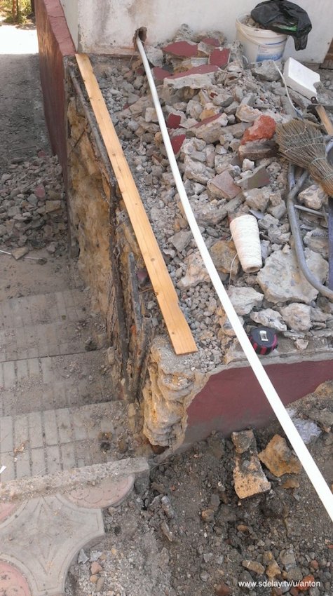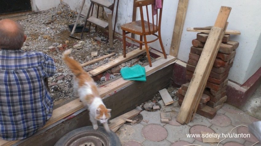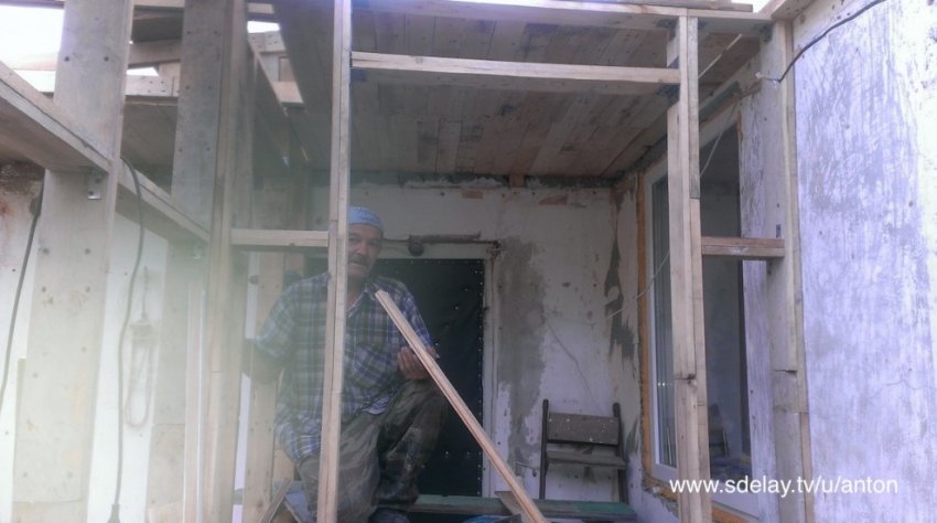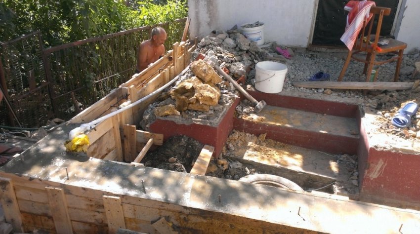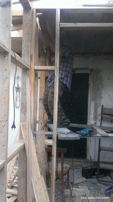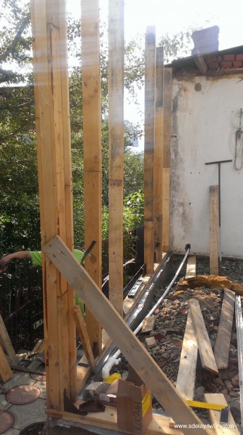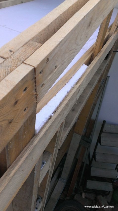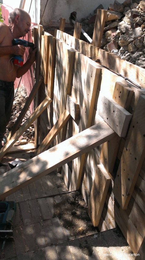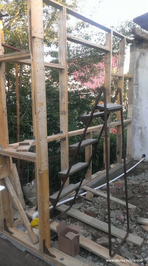 Одну стену частично разобрали. Монтировали опалубку из тех же досок от паллет. Паллет у нас было около сотни, так что не жалели.