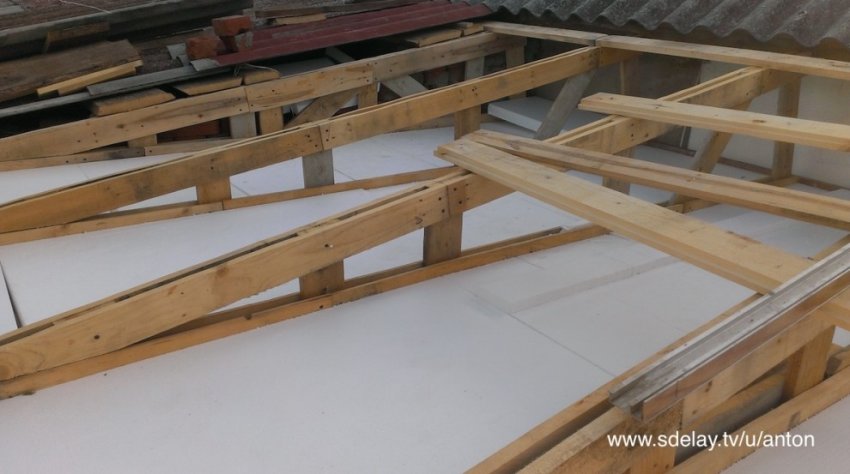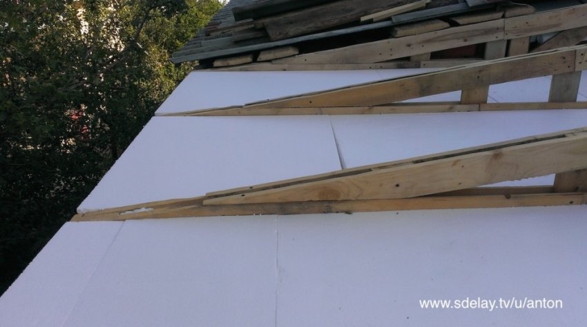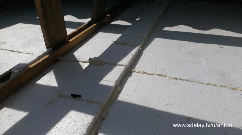 В качестве утеплителя потолка, как видите, использовали пенопласт, листы которого плотно забивали друг к другу.
