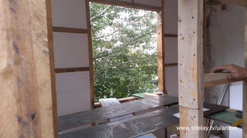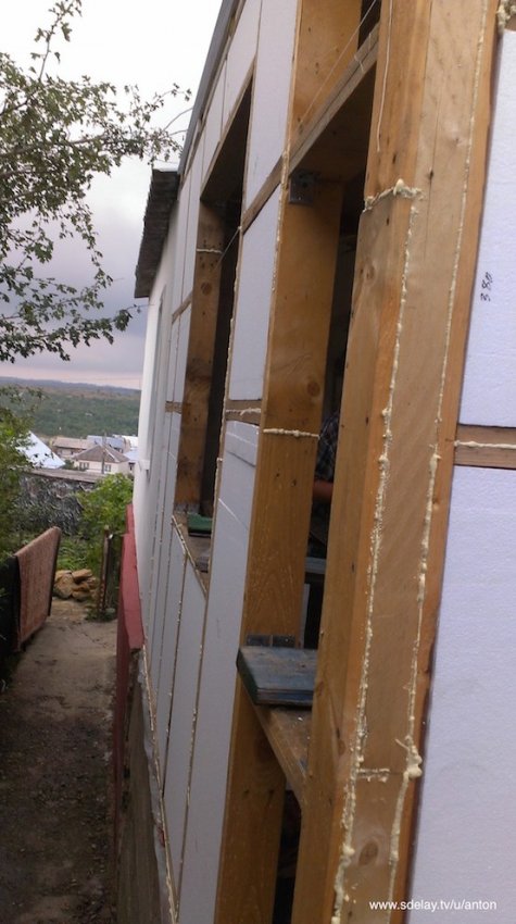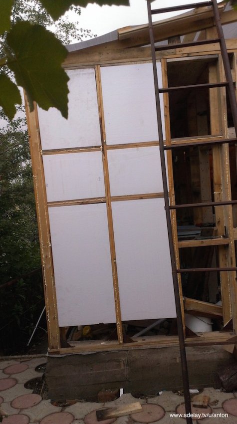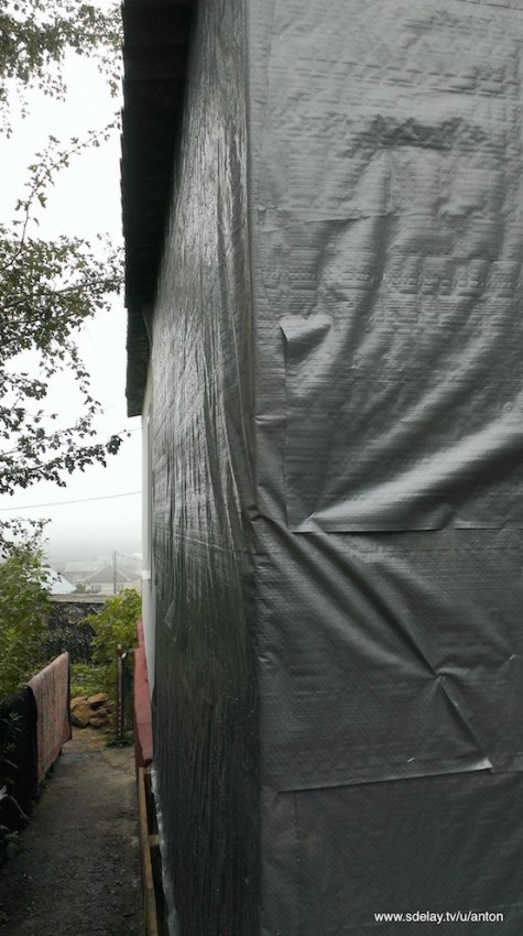 Снаружи обили гидроизоляционной пленкой - Ютафолом, после чего будет сайдинг.