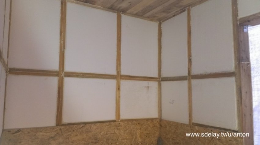 Стены каркаса также утеплили пенопластом, плотно забивая и запенивая все стыки и щели.