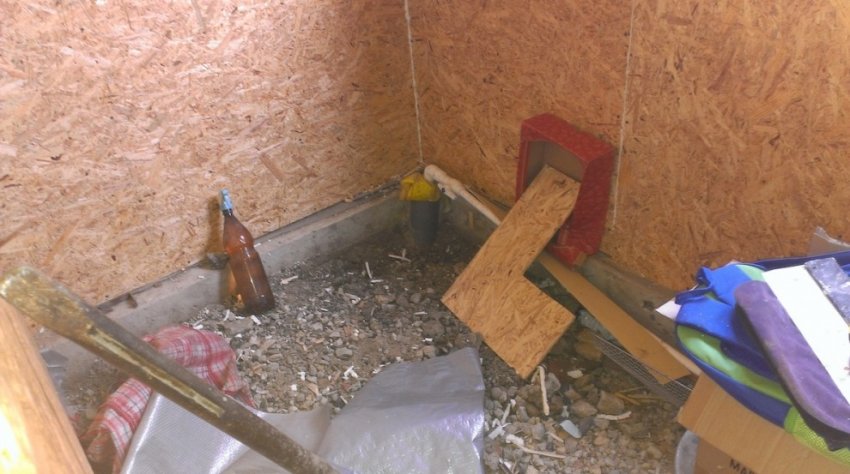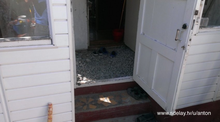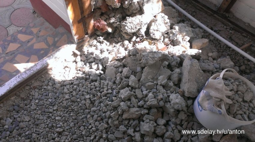 Тамбурок выглядел вот так, тоже каркасный, обшитый фанерой и винилкой. Полы были кафельные, кафеь лежал на бетоне. Пру часов работы кувалдой и ломиком пол превратился в такую бетонно-гравийную крошку. Было 2 слоя бетона, но мы его победили.