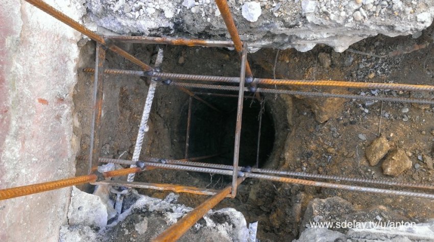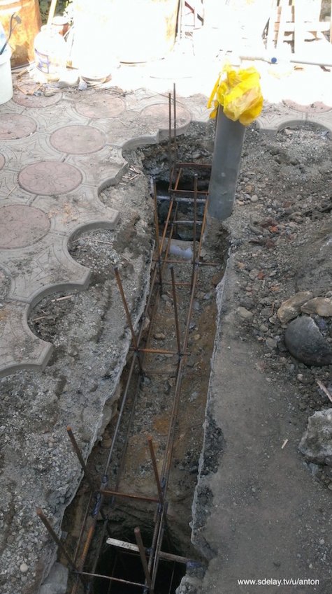 По периметру мы прокопали траншею для заливки фундамента. Это бы не простой грунт, а пласты камня ракушечника, который мы пропиливали болгаркой алмазным кругом. По углам и по середине пробурили скважины на глубину 1,5 - 1,7 метра и все заложили арматурой.