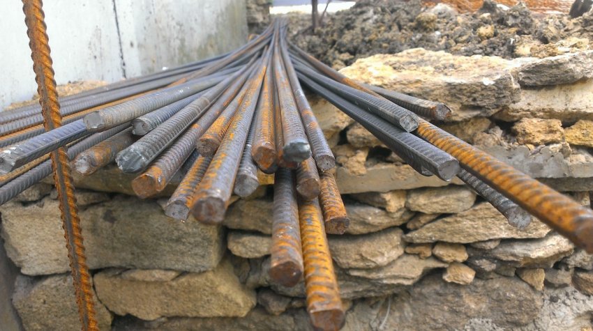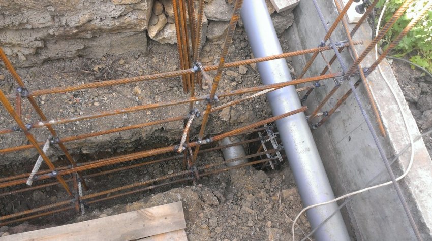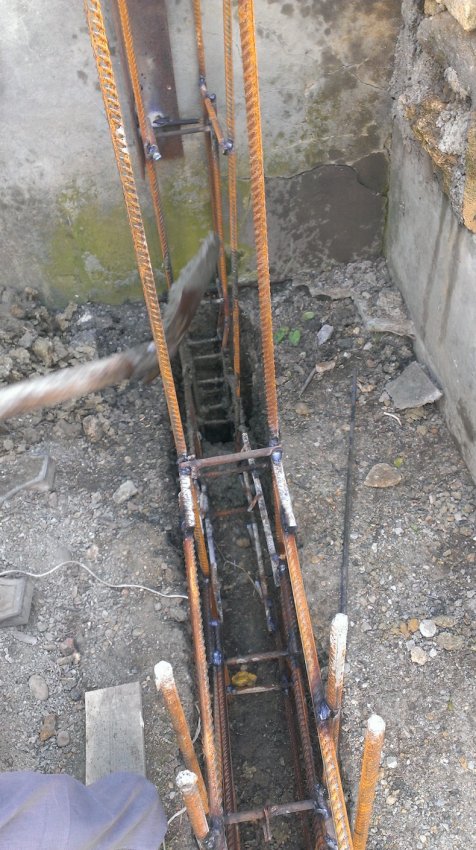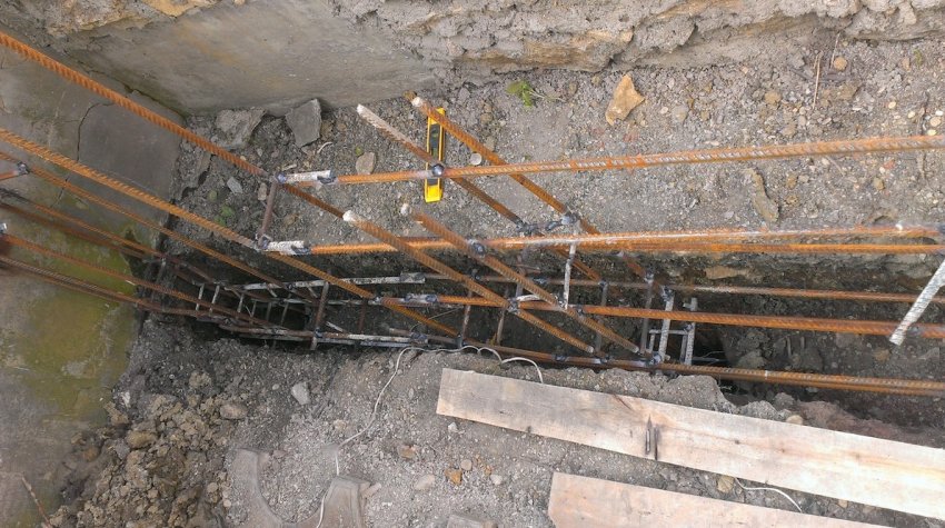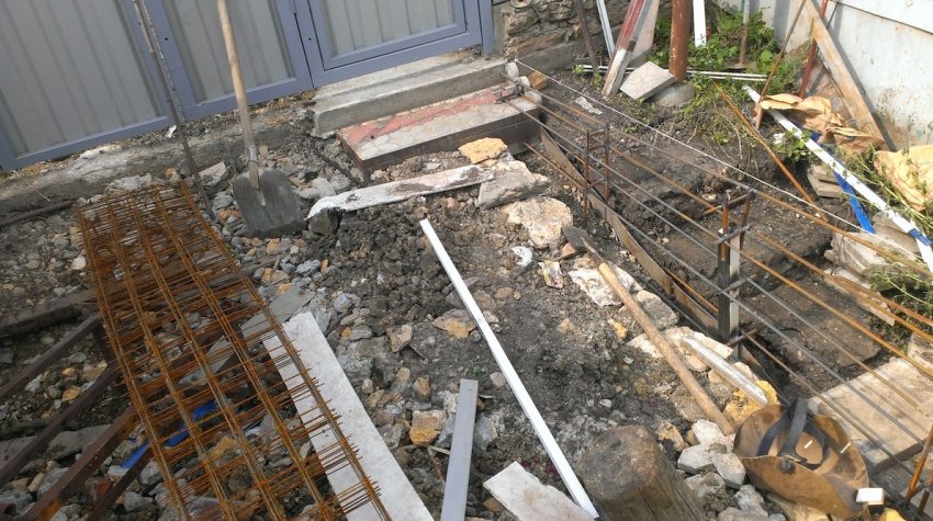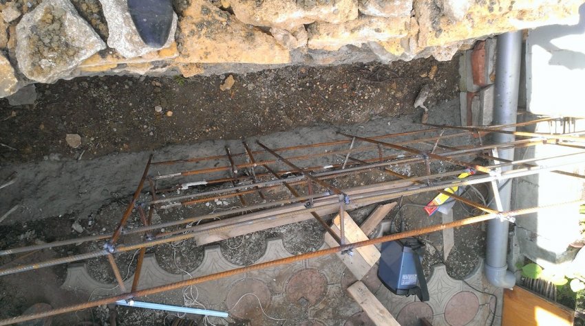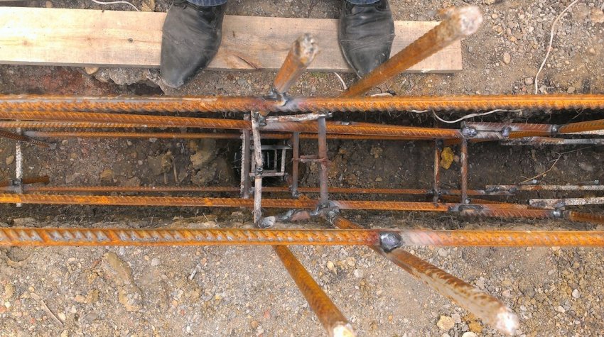 На этом участке траншеи забурили 3 небольших "скважины", куда вставили квадраты (столбы) из арматуры. Забурили где-то на метр глубиной.