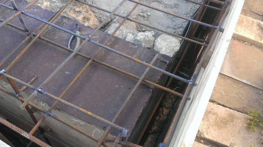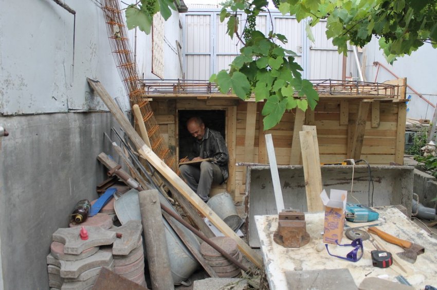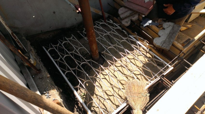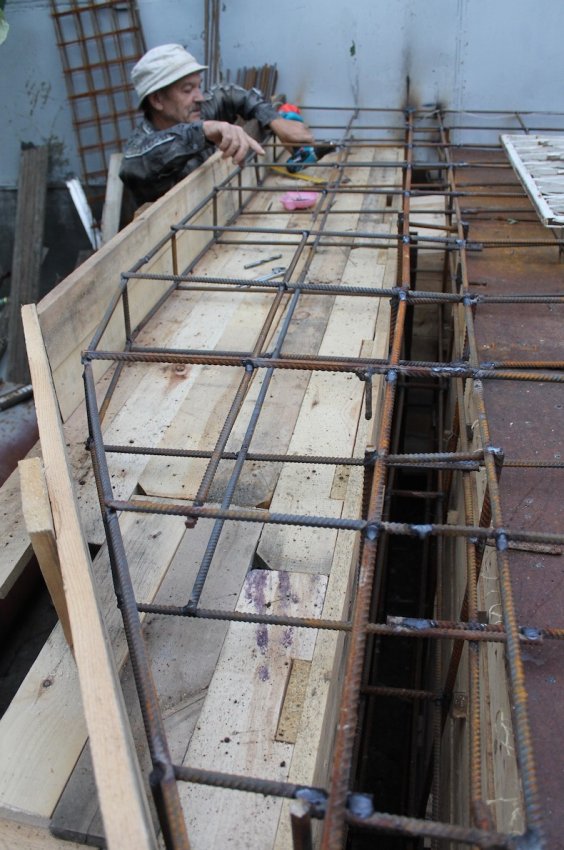 Когда миксер начал сгружать бетон, все шло хорошо и гладко, по началу, пока не раздался треск. Задня стена опалубки не выдержала и начала трещать. Представляете, да? Опалубка под давлением бетона начинает разъезжаться и тут понеслось. Начали вспоминать всё и всех ))). Приостановили выгрузку бетона и кинулись на ликвидацию аварии. Чем можно подперли, забили трубы в землю, другими расперли и приварили, зафиксировав опалубку.
