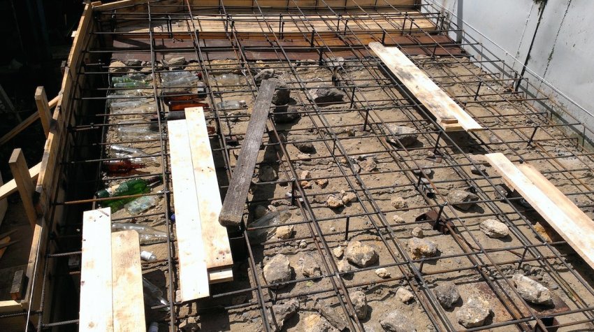 Сама площадка у нас на склоне, и чтобы вывести уровень, пришлось это место засыпать околом, землей, строительными отходами, бутылками и т.д. Засыпали, трамбовали.... раз за разом.