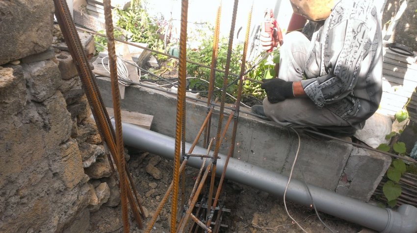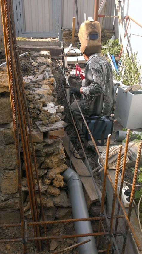 Сварка арматуры. Кто-то скажет что это не правильно - сваривать арматуру, и нужно скручивать... Об этом мы спорили уже в статье про водопровод. Но мы варили, и так как конструкция будет заливаться бетоном и сверху кроме авто не будет никаких нагрузок, то я считаю что данный способ вполне приемлем.