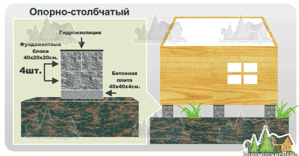 Обычно, столбчатые фундаменты используют для облегчённых конструкций домов, дачи или бани.