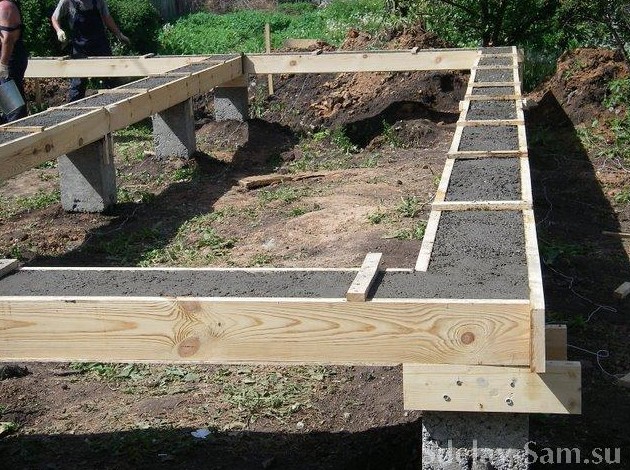Кстати, арматура не должна выпирать из бетона. После того, как связан каркас, можно заливать бетон. Чтобы фундамент получился прямоугольной формы, после разметки, нужно замерить его диагонали, то есть расстояние до противоположенных углов.
