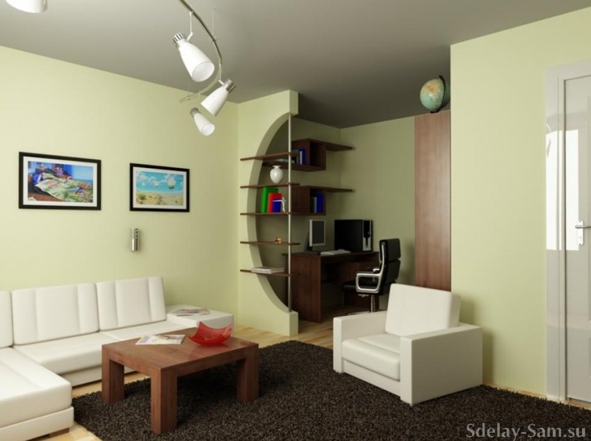 Одно комнатные и двух комнатные квартиры для обеспечения нормального исполнения бытовых функций правильнее всего необходимо зонировать т.е. выделять специальные зоны. На верхней фотографии показано как выделены зоны кабинета (для выполнения письменных работ или домашних заданий школьников ) и зона для приёма гостей.
