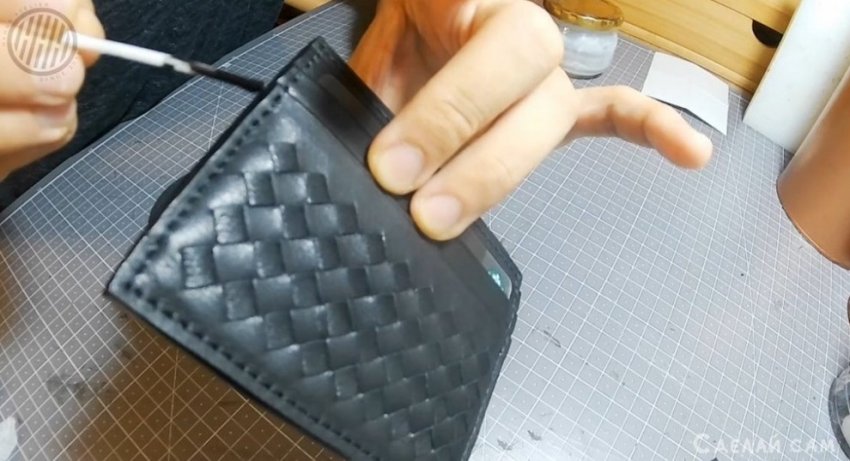 Далее, собираем картхолдер из частей. Проклеиваем, пробиваем отверстия пробойником, прошиваем.