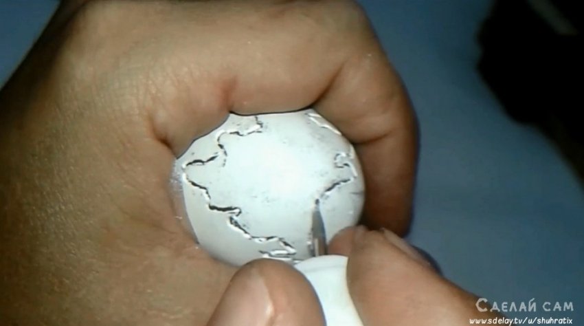 Здравствуйте! В последней моей статье я описывал процесс изготовления насадки бор машины для шуруповерта. После этого, я стал тестировать бор машину с различными материалами, борами и дисками. Как вдруг вспомнил что лет пять назад набрел на специализированный сайт по резке на скорлупе яиц и решил опробовать свой инструмент на такой деликатной поверхности как скорлупа. Сделав несколько не замысловатых завитушек я увлекся, стал пробовать нарезать различные узоры и решил, что раз у меня стало неплохо получаться, то неплохо бы и поделиться (хоть и не большим, но все же) опытом с вами. И так приступим. Для начала нужно опустошить яйцо от содержимого. Проткнув иглой скорлупу с двух сторон и загоняя шприцом воздух в яйцо, я выдул из него питательный продукт. Хочу признаться, что пять из десяти яиц я испортил именно на этом этапе. Оказалось, что как не старайся проткнуть иглой пленку оболочки желтка в яйце, при выдувании эта пленка перекрывает маленькое отверстие от иголки. И от переизбытка давления воздуха создаваемым шприцом, яйцо лопалось. Проблема решилась после увеличения одного из отверстий. Белок с желтком беспрепятственно вытекли из скорлупы. После этого, тем же шприцом, я промыл скорлупу от остатков и оставил ее сушиться на сутки. Просушив скорлупу, я принялся наносить узоры простым карандашом. Так как в этой сфере я человек неопытный и узоры в последний раз рисовал, наверное, в школе, нарисованные мною формы стали наталкивать на мысль что эта затея обречена на провал. Но, отогнав злые мысли, я решил идти до конца и приступил к резке. Узнал у бывалых резчиков что начинать резать нужно с середины яйца и постепенно переходить к краям с отверстиями. Если начать резку с краев, а потом уже в середине, то есть риск что яйцо поломается и придется начинать заново. Установив грушевидный бор в зажим наконечника, обхватив скорлупу яйца и начал сверлить его держа бор под углом примерно 45 градусов относительно поверхности. А затем выпилил размеченный лепесток и так по всей площади яйца. И оказалось, кривая разметка— это не так страшно. по ходу работы можно корректировать рисунок, только лишь ориентируясь на разметку. Но рисовать конечно веже надо аккуратнее. Немного привыкнув к резу алмазного бора я стал нарезать более уверенно и быстрее. Мне этого показалось мало, и я решил вырезать что ни будь по сложнее. В поисковике браузера ввел «развертка глобуса», выбрав приемлемый для меня результат, скачал и по размерам яйца, распечатал развертку глобуса. При помощи бумажного клея приклеил ее к копировальной бумаге и скальпелем вырезал лишнее. Обернув разверткой скорлупу, свел каждый ее лепесток зафиксировав их между собой скотчем. Глобус получился не идеальный, это и понятно ведь развертка рассчитана под сферу, а не под эллипс. Но это не так важно, ведь мне нужно было всего лишь обвести ручкой по контурам материков. Закончив с обводкой рисунка, освободил скорлупу от бумаги и приступил к резке бором по контуру скопированного рисунка. Для этой работы я установил тоненький конусный бор. Вырезав рисунок, осталось удалить внутреннюю пленку скорлупы. Для этого нужно развести в небольшой емкости любой, хлорсодержащий отбеливатель для белья и замочить скорлупки на ночь. На самом деле пленку нужно было удалить еще до резки, но на тот момент я этого не знал. 