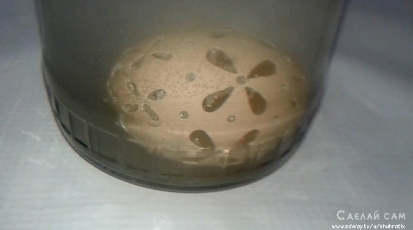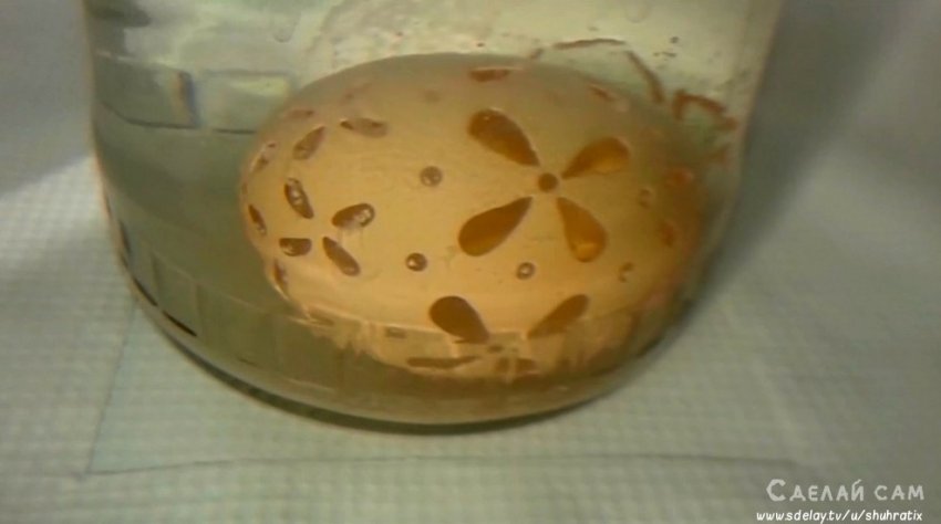 Вырезав рисунок, осталось удалить внутреннюю пленку скорлупы. Для этого нужно развести в небольшой емкости любой, хлорсодержащий отбеливатель для белья и замочить скорлупки на ночь. На самом деле пленку нужно было удалить еще до резки, но на тот момент я этого не знал.