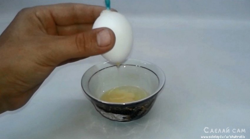 Для начала нужно опустошить яйцо от содержимого. Проткнув иглой скорлупу с двух сторон и загоняя шприцом воздух в яйцо, я выдул из него питательный продукт. Хочу признаться, что пять из десяти яиц я испортил именно на этом этапе. Оказалось, что как не старайся проткнуть иглой пленку оболочки желтка в яйце, при выдувании эта пленка перекрывает маленькое отверстие от иголки. И от переизбытка давления воздуха создаваемым шприцом, яйцо лопалось. Проблема решилась после увеличения одного из отверстий. Белок с желтком беспрепятственно вытекли из скорлупы.