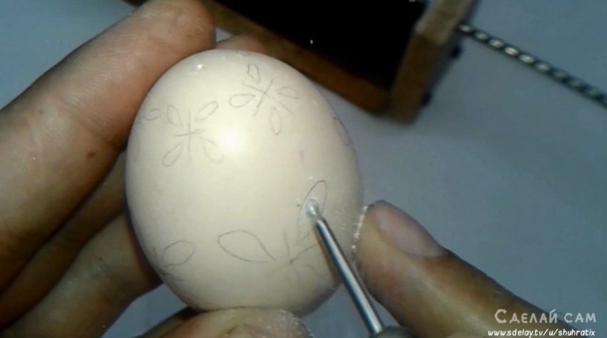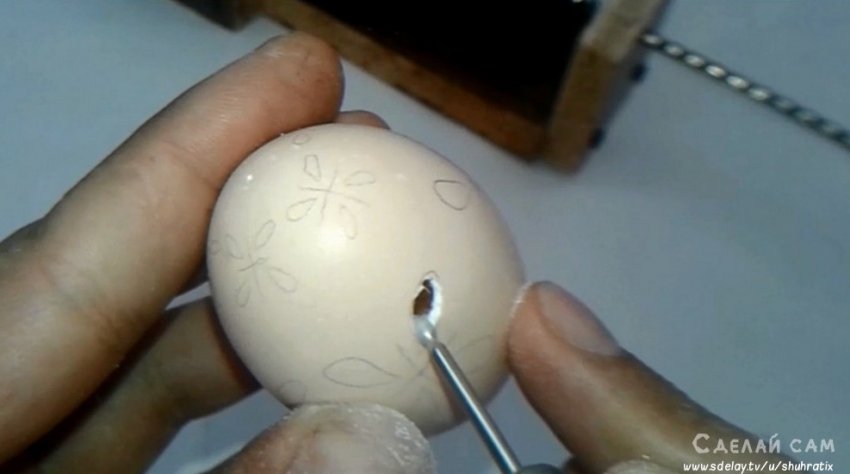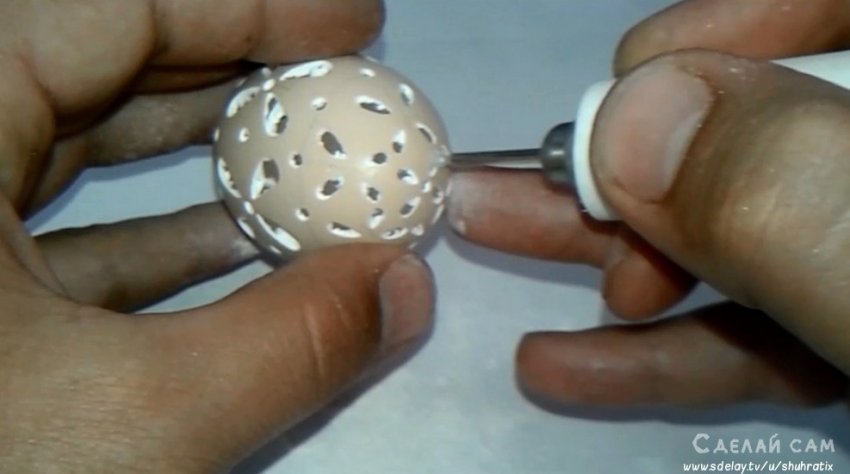 Установив грушевидный бор в зажим наконечника, обхватив скорлупу яйца и начал сверлить его держа бор под углом примерно 45 градусов относительно поверхности.