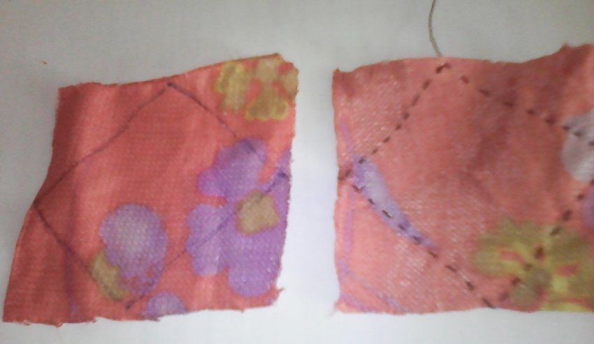 Для листочков я сложила зеленую нейлоновую ткань в 4 раза. Листочки получились жесткими, хорошо стоятЛисточки в полуготовом состоянии: необходимо обжечь некрасивую махру по краям. Листочков изготовила 7 - 8 шт. Длина проволоки в готовом сотоянии - 5смДля верхнего слоя я взяла яркую цветастую ткань. Вырезала 5 квадратов. В квадраты вписала ромбы, соединяя середины сторон. по намеченной линии крепкой ниткой мелкими стежками прошила и закрепила