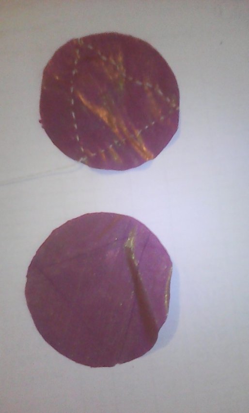 Для второго слоя я взяла однотонную ткань от зонта, вырезала круги, внутрь вписала треугольникиМелкими стежками прошила