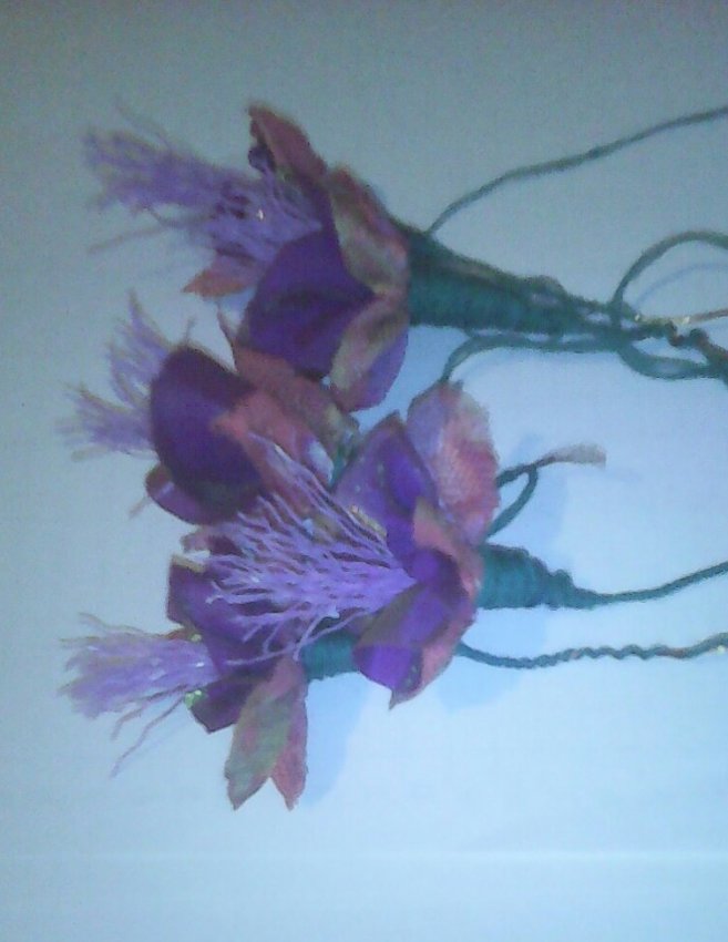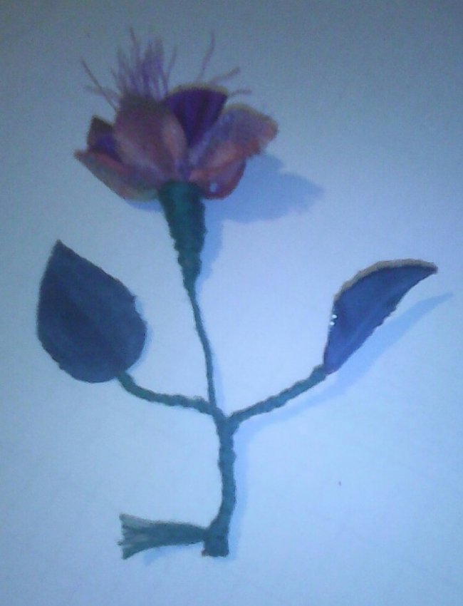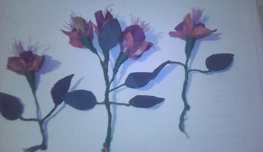Зелеными нитками, сложенными в 3 - 4 раза, тщательно обмотала цветоножку и стебель