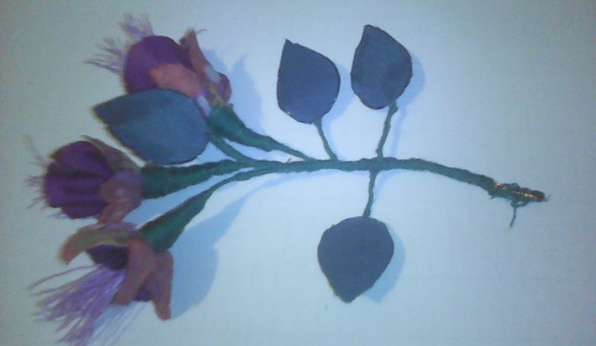 Собираю боковой элемент из 1 цветка и 2 листиков, тщательно обматываю места стыков. Если проволока мягкая, советую на этом этапе дополнительно усилить стебель от цветка до "корня", чтобы цветок прямо стоял и не клонился