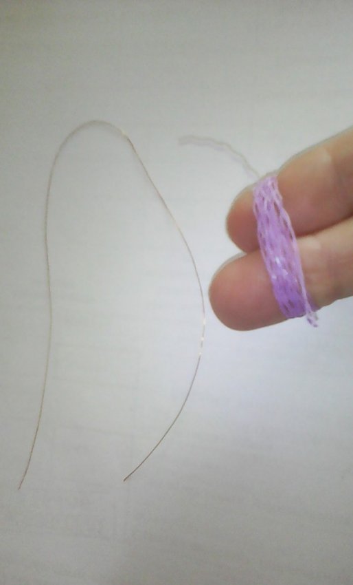 Я выдернула нитку из сетки, в качестве основы для намотки можно использовать линейку, но я намотала на самый удобный инструмент: свои два пальца правой руки (они же всегда-всегда под рукой). 15 - 20 оборотов будет достаточкно. Экспериментируйте с расцветкой и толщиной. Проволокой перехватила снизу, обвязала ниткой кисточку возле проволоки, разрезала ввверху.