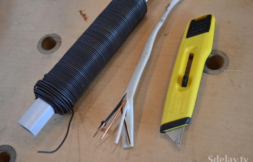 Отрежьте два куска вязальной проволоки. Если проволока находится в изоляции, ее прийдется снять. Нам нужны будут оголенные провода.