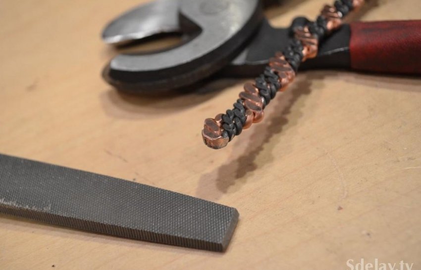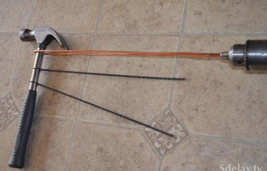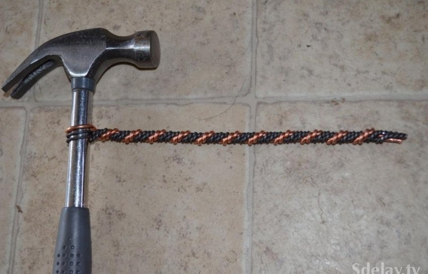 Внимание! Стараемся скрутить провода так сильно, как Вы сможете. После завершения, снимите накрученную проволоку с молотка и отрежьте нескрученные края.