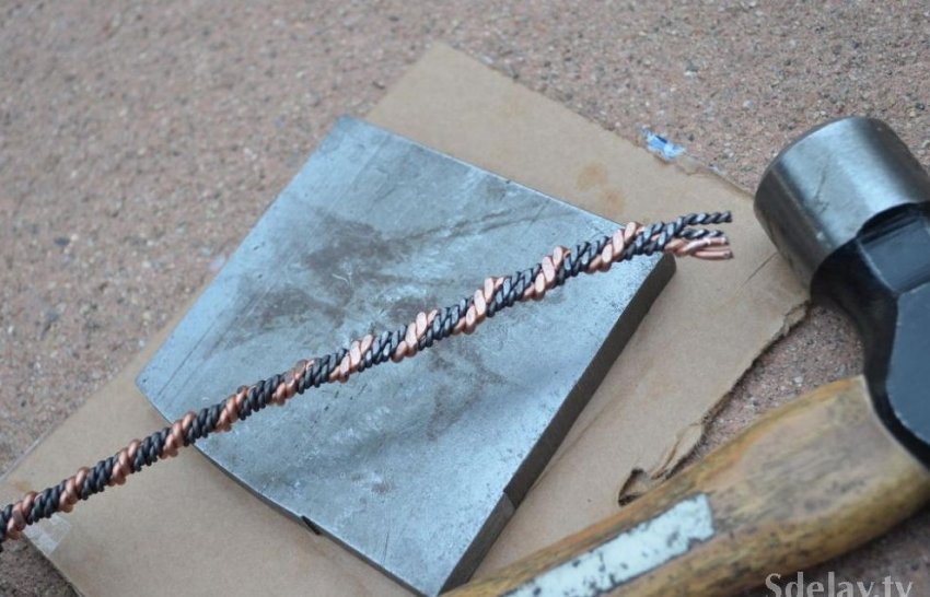 Берем молоток и бьем только по одной стороне скрученной проволоки. Положим проволоку на твердую поверхность. Важно, что бы толщина проволки по всей длине была одинакова.