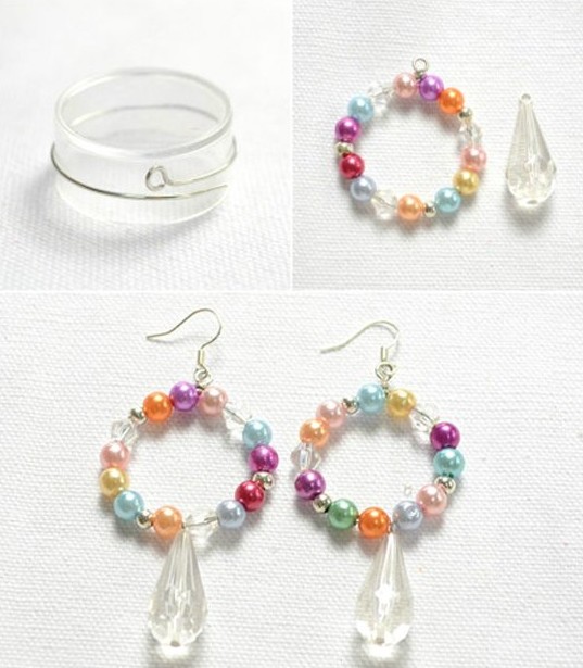 В этот раз хочу поделиться с Вами информацией по созданию интересных серёжек в виде колец с жемчугом со вставками металлических и стеклянных бусин. Если Вы ещё только новичок в изготовлении бижутерии, то этот мастер-класс будет для Вас полезным. Необходимые материалы: Цветной жемчуг 6мм (можно использовать жемчуг Сваровски) Биконусы Сваровски 6ммCrystal Cтеклянные бусины- (можно тоже бусины-капли Сваровски) Металлические бусины 4мм Пины с шариком Проволока 0,8мм Инструменты: Круглогубцы Кусачки 1. Отрежем кусок проволоки длиной 8 см и сделаем петлю на одном из её концов с помощью круглогубцев. 2. Возьмём какой-нибудь цилиндрический предмет (например, маленькую баночку) и обернём нашу проволоку вокруг него. 3. Наберём на проволоку наши бусины в случайном порядке и затем закрепим наше кольцо с помощью обёртывания конца проволоки вокруг петельки и бусин. 4. Проденем пин сквозь нашу бусину-каплю, сделаем петельку на другом конце и подвесим капельку посередине кольца, а затем закроем петельку. 5. И завершим наше изделие с помощью основ для серёжек. Надеюсь, этот несложный мастер-класс будет Вам полезен, особенно если Вы только делаете свои первые шаги в изготовлении бижутерии. Вы можете использовать также и похожие материалы для создания таких серёжек, а также фурнитуру другого цвета.
