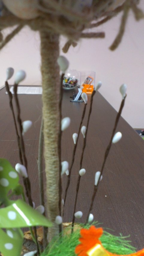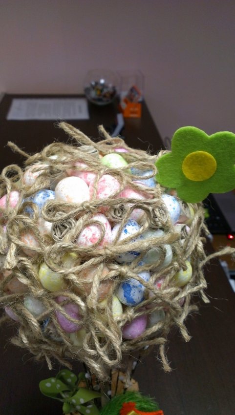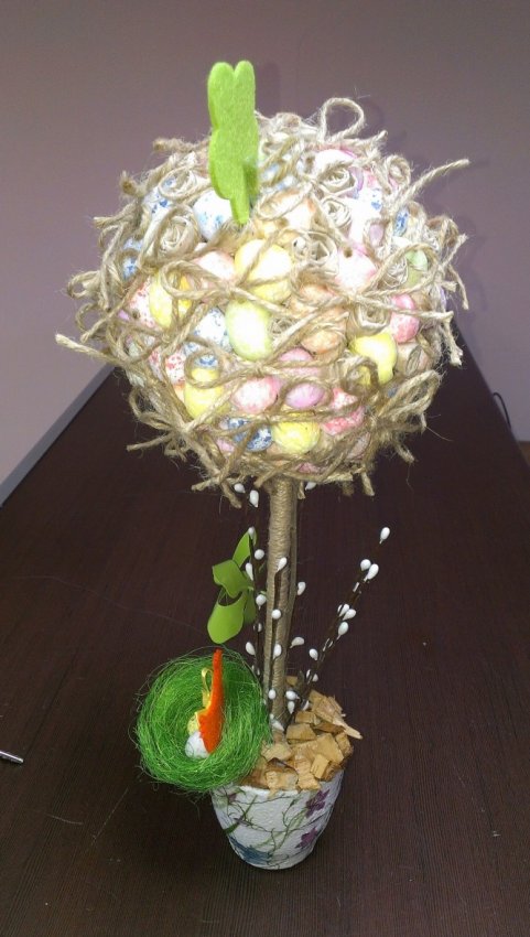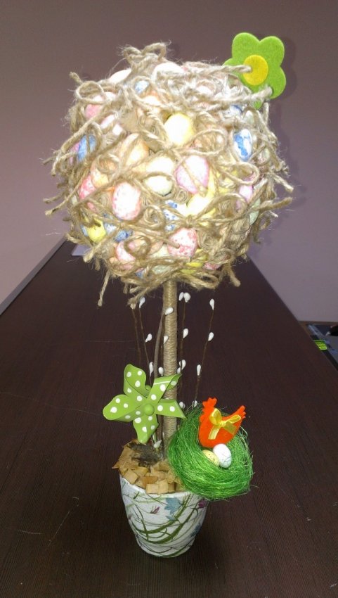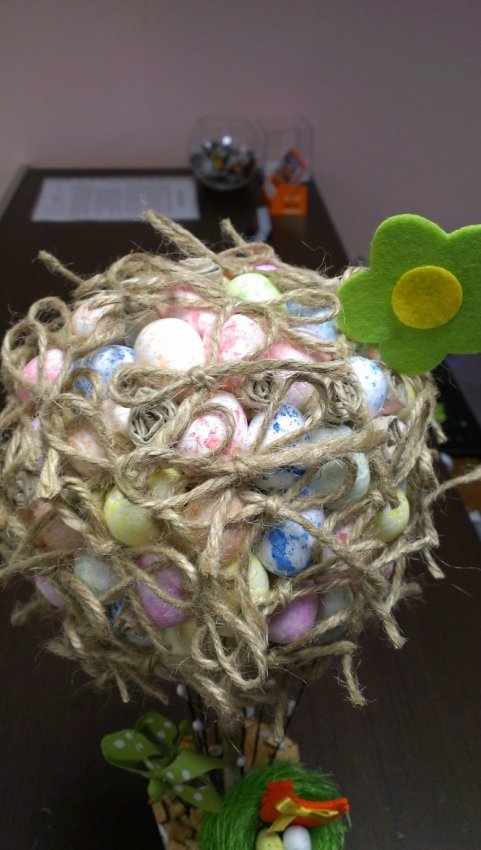На фото видно, что верхняя часть дерева "Крона" состоит из склеенных пенопластовый яиц, шпагата, завязанного в бантики и свернутых кусочков бумаги. Все это декорировано и хорошо склеено термоклеевым пистолетом