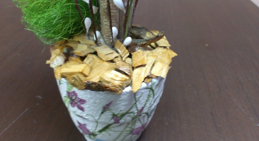 Нижняя часть также декорирована деревянными кусочками. Стружкой их нельзя назвать, так как сильно крупные.
