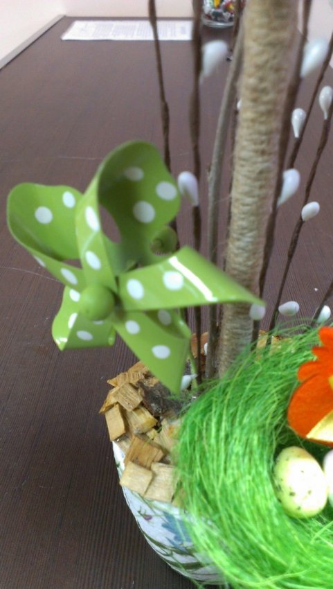 В нижнюю часть вставлены деревянные веточки . Зеленый пропельлер - металлический.