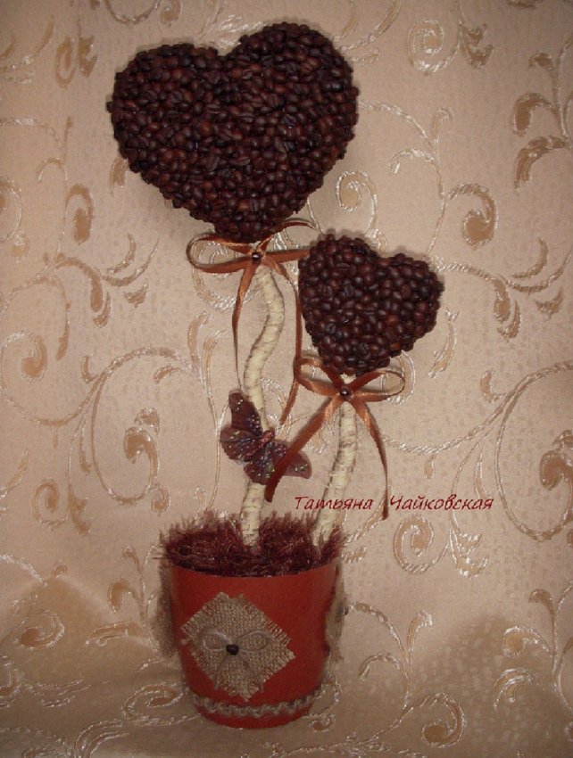 Сегодня мы делаем дерево из кофе в виде сердец. Отличный подарок и сувенир любимым и влюбленным. Данное дерево не только изящна по своей форме, а также имеет приятный запах кофе, который может украсить и божественно благоухать в любой комнате, дополнять неповторимый интерьер в зале или на кухне.