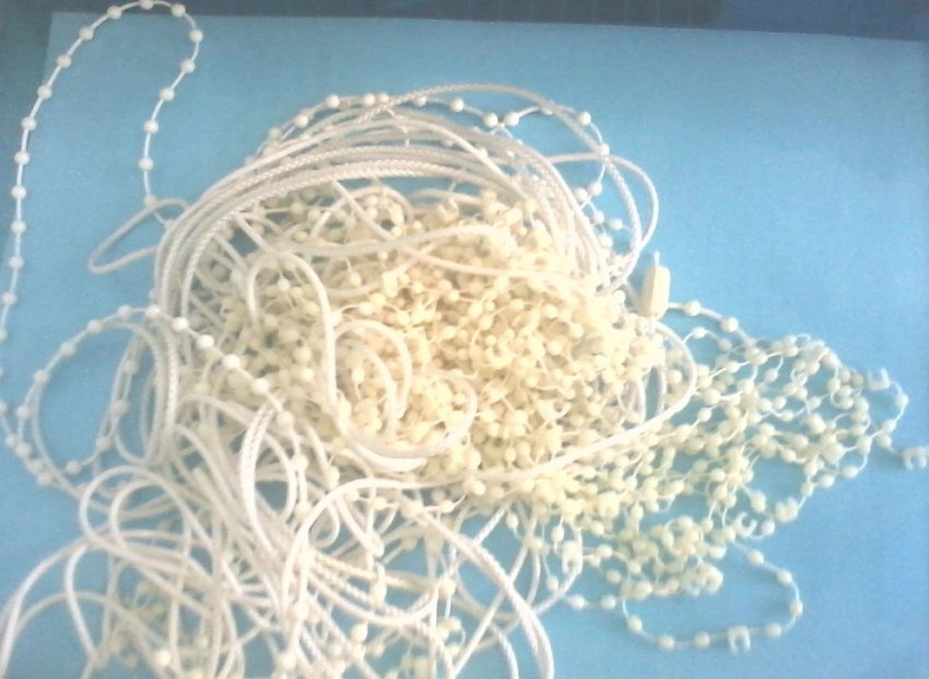 По нижнему краю вертикальных жалюзи продернут крепкий нейлоновый шнур с нанизанными пластиковыми шариками.